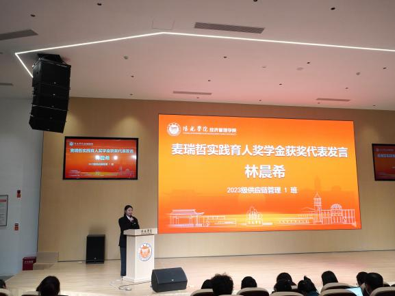 麦瑞哲实践育人奖学金获奖代表、2023级供应链管理专业林晨希同学在会上分享了她从“直播小白”到带领团队创下百万GMV、荣获福建省直播电商职业技能大赛一等奖的实战经历。她表示,通过参与麦瑞哲支持的实战项目,从直播运营到电商数据分析,不仅将课堂所学知识应用于实际工作,更锻炼了解决复杂问题的综合能力,“实战不是‘有能力再出发’,而是在实践中变强。”