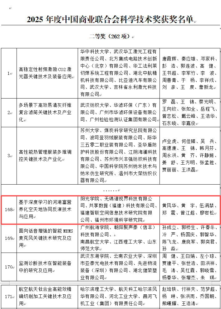 日前,2025年度“中国商业联合会科学技术奖”评选结果正式揭晓,阳光学院人工智能学院院长黄风华教授组队牵头完成的“AI+环保”项目——《基于深度学习的河湖富营养化空天地协同反演技术与应用》,凭借扎实的创新实力和显著的应用成效,荣获科技进步奖二等奖。