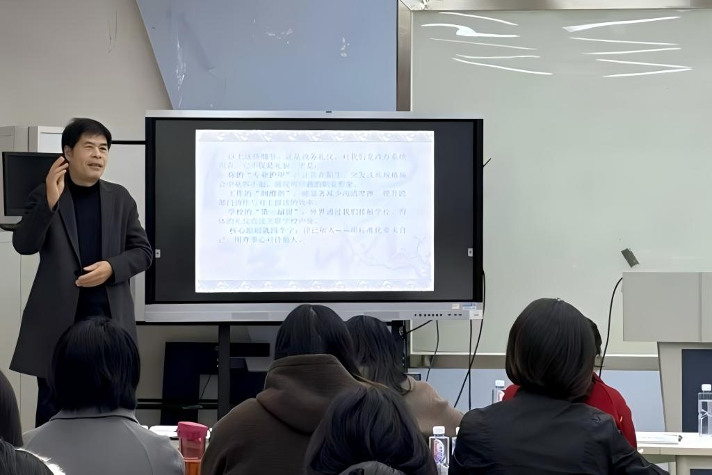 副校级督学胡英清以“人无礼不立,事无礼不成”开篇,生动阐述了公共礼仪在行政工作中的重要价值,从沟通礼仪、位次安排、着装规范到公共关系维护、应急处理等方面展开讲解,助力行政人员塑造专业、可信的职业形象。