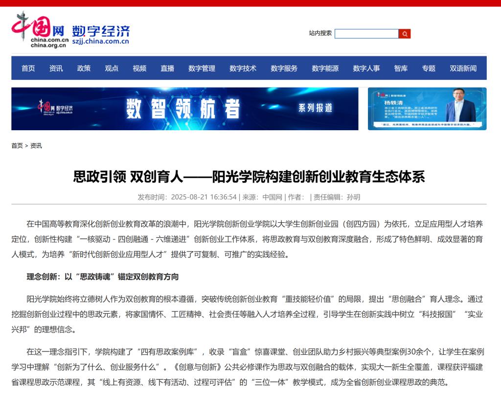 该体系的构建与实践,不仅培养了一批兼具创新精神、创业能力和社会责任感的应用型人才,更形成了“思政引领方向、平台支撑实践、产业反哺教育”的创新创业教育新范式。未来,阳光学院将继续深化“一核驱动-四创融通-六维递进”模式的探索,为中国高等教育创新创业教育改革贡献更多“阳光智慧”。(阳光学院:王苹、林颖)