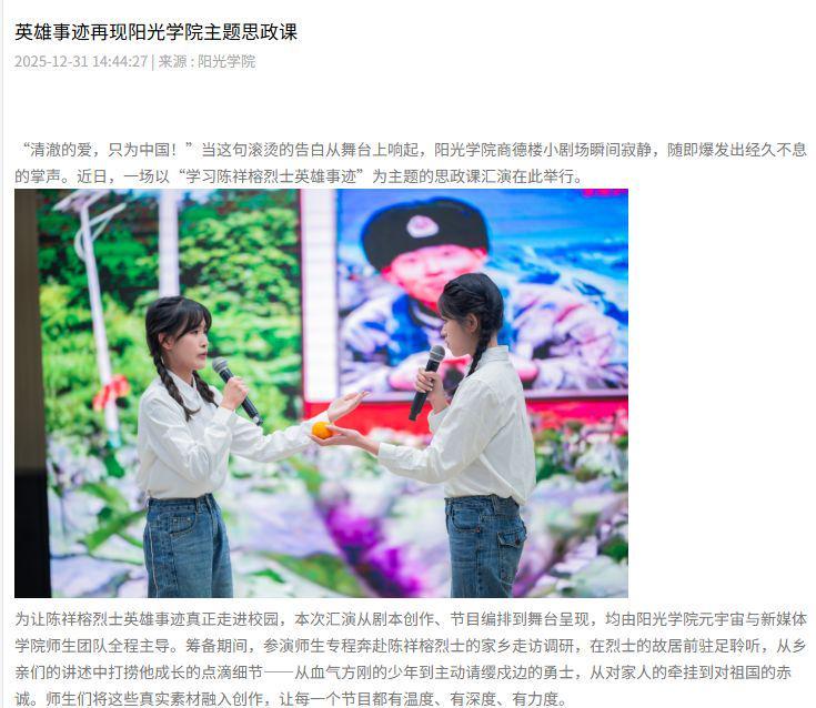 福建教育网:英雄事迹再现阳光学院主题思政课