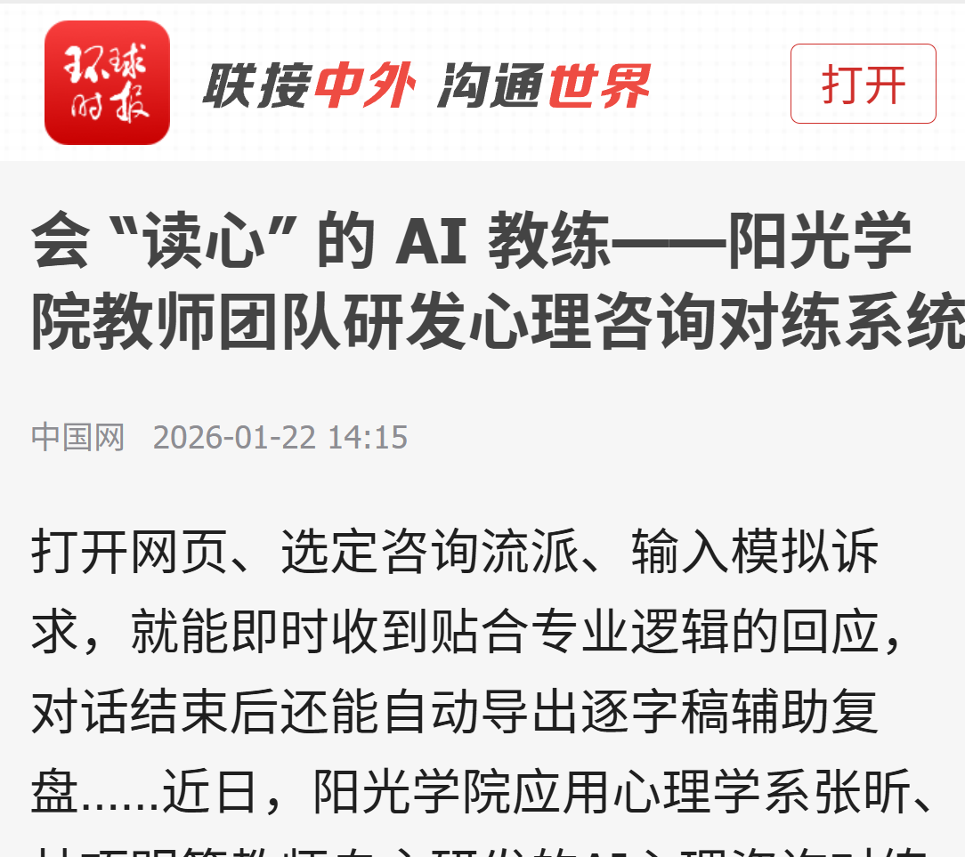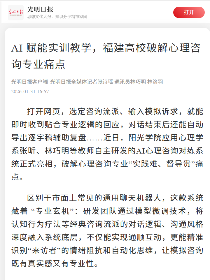 打开网页、选定咨询流派、输入模拟诉求,就能即时收到贴合专业逻辑的回应,对话结束后还能自动导出逐字稿辅助复盘……近日,阳光学院应用心理学系张昕、林巧明等教师自主研发的AI心理咨询对练系统正式亮相,用智能技术破解了心理咨询专业“实践难、督导贵”的行业痛点,为国内心理学实训教学领域提供了新范本。