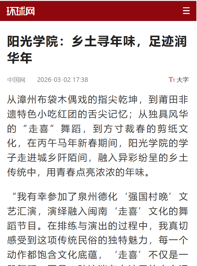 从漳州布袋木偶戏的指尖乾坤,到莆田非遗特色小吃红团的舌尖记忆;从独具风华的“走喜”舞蹈,到方寸裁春的剪纸文化,在丙午马年新春期间,阳光学院的学子走进城乡阡陌间,融入异彩纷呈的乡土传统中,用青春点亮浓浓的年味。