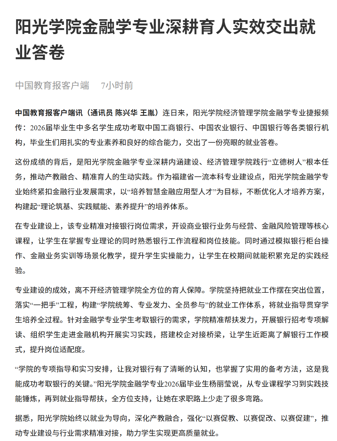 “学院的专项指导和实习安排,让我对银行有了清晰的认知,也掌握了实用的备考方法,这是我能成功考取银行的关键。”阳光学院金融学专业2026届毕业生杨丽莹说,从专业课程学习到实践技能锤炼,再到就业指导帮扶,全方位支持,让她在求职路上少走了很多弯路。