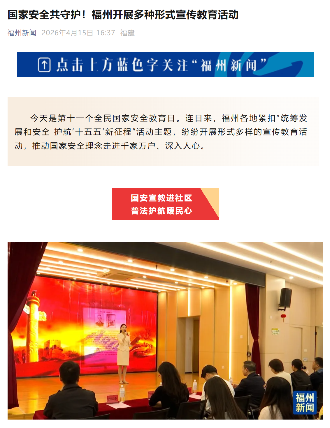 在马尾区,全民国家安全教育日宣讲大赛在阳光学院校本部举办,大赛以“国安为帆护航程发展为舵向未来”为主题,选手们以真挚情感、鲜活案例讲述国家安全故事。此次活动采用“阵地宣传+主题宣讲”相结合的模式,将国家安全教育与校园文化建设深度融合,有效提升了师生国家安全意识和法治素养。